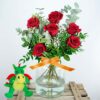 Regalar un ramo de 6 rosas rojas y un lazo con los colores de la señera para el dia de Sant Jordi + peluche dragón Sant Jordi (14cm) (Jarrón no incluido)
